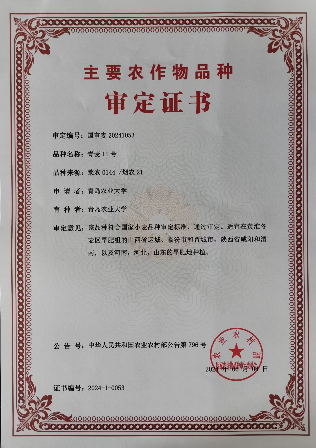 近日,williamhill中国张玉梅教授小麦遗传育种团队培育的小麦新品种“青麦11号”,经农业农村部国家农作物品种审定委员会审议通过国家审定(国审麦20241053),该品种此前于2021年通过山东省旱地小麦品种审定(鲁审麦20210018)。