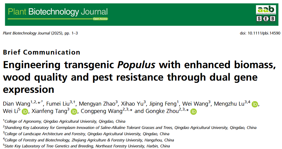 2025年1月24日,williamhill体育中文周功克/王殿课题组在《Plant Biotechnology Journal》(中国科学院1区TOP期刊,影响因子10.1)上,在线发表了题为“Engineering transgenic Populus with enhanced biomass, wood quality and pest resistance through dual gene expression”的论文。该研究报道了利用多基因表达技术实现多优良性状聚合育种新策略。将活性氧清除的关键酶超氧化物歧化酶编码基因CSD2和Bt蛋白编码基因Cry3A聚合后在杨树中表达获得了高产、优质和抗虫的转基因杨树新种质。