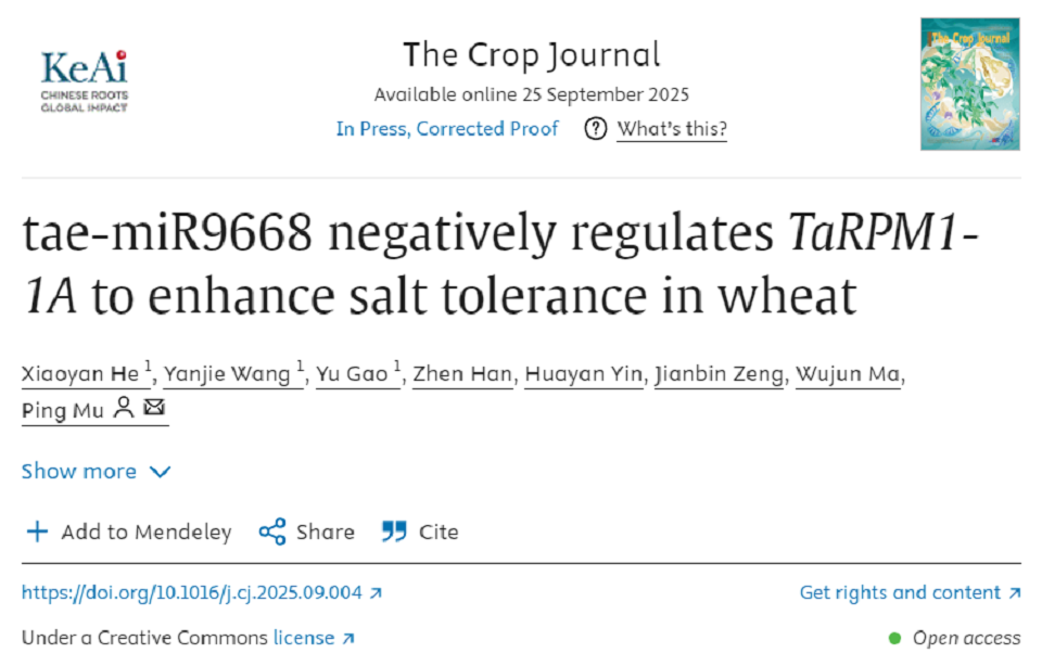 近日,williamhill体育中文穆平教授课题组在The Crop Journal(中国科学院1区TOP期刊,影响因子5.6)上,在线发表了题为“tae-miR9668 negatively regulates TaRPM1-1A to enhance salt tolerance in wheat”的研究论文。该研究系统解析了tae-miR9668–TaRPM1-1A模块在小麦耐盐中的调控作用,并进一步发现TaRPM1-1A与TaSnRK1.3-D的互作关系,为小麦耐盐分子育种提供了新靶点。