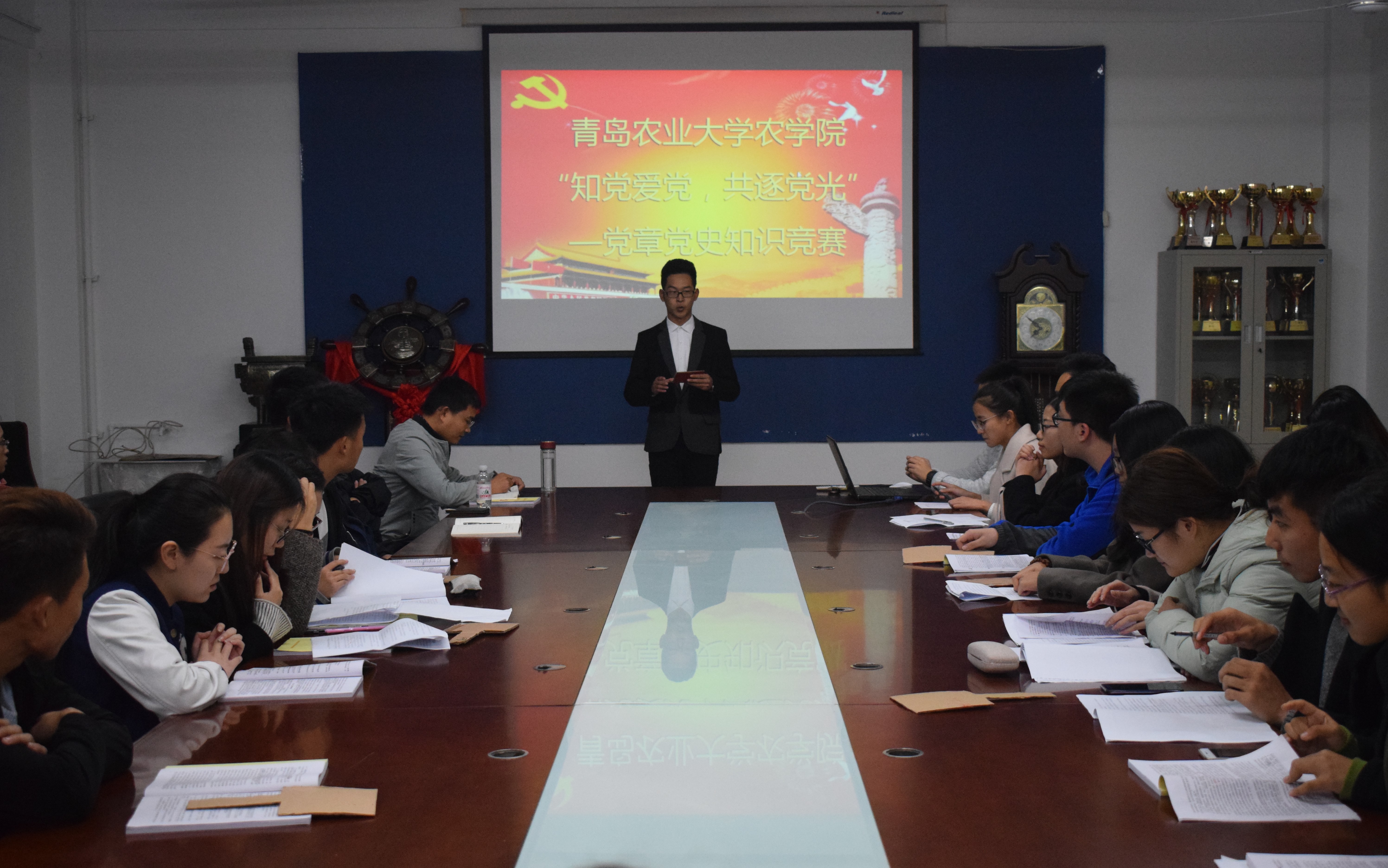 活动开始,谷元兴讲到此次竞赛旨在进一步深入学习宣传贯彻十九大精神,端正入党动机,提高党性修养。随即,各队之间展开了激烈的角逐。本次竞赛共设有三个环节,分别为必答题、抢答题和风险题,按照得分情况确定最终成绩。知识竞赛紧紧围绕着中国共产党的历史、发展、取得成就等方面展开,并融入党的最新理论成果,设计合理,内容全面。经过三轮激烈角逐,前三名小组脱颖而出。