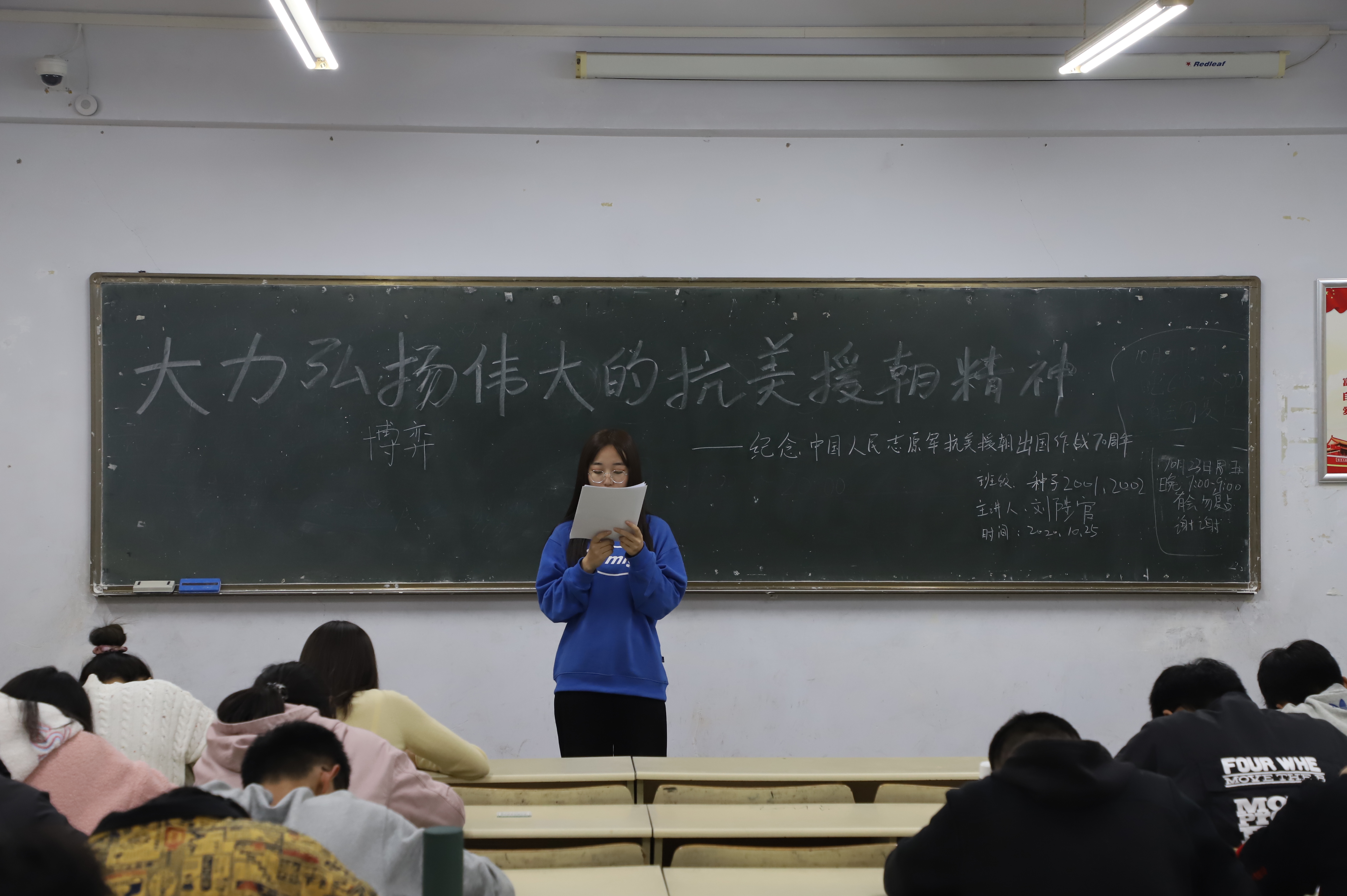 10月25日,williamhill中国于教学区开展“大力弘扬伟大的抗美援朝精神”主题团课,旨在纪念抗美援朝胜利70周年,铭记历史,致敬英雄,弘扬爱国主义精神。2019级、2020级全体学生积极参加。