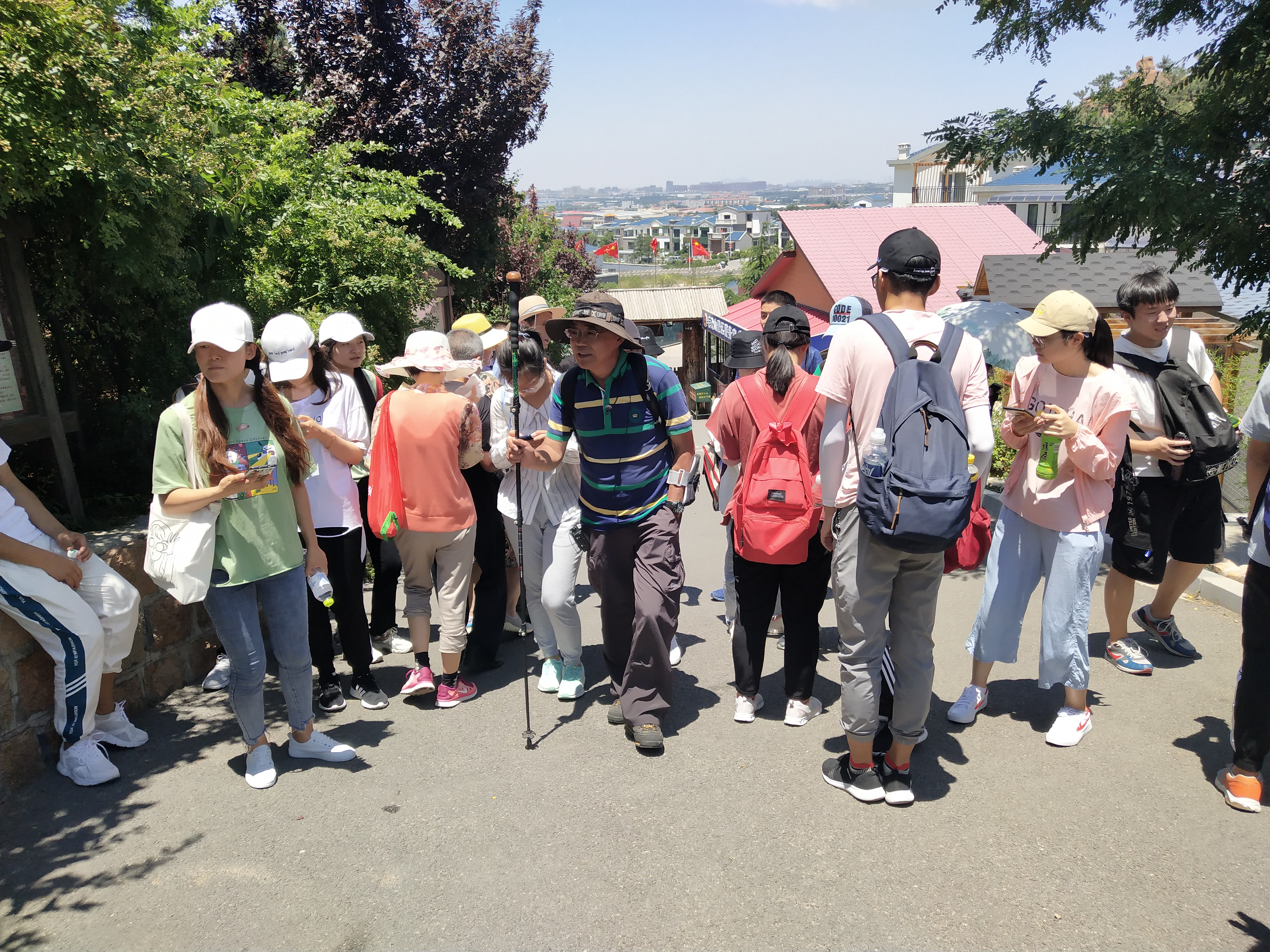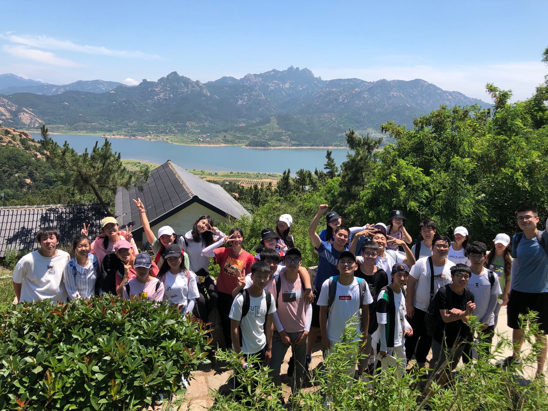 首先, 同学们乘坐大巴车来到了毛公山。老师带领同学们先认识村子里的植物,向同学们讲解每种植物的名称、科属种以及其生活习性。随后,老师带领同学们登山认识植物,尽管天气炎热,大家还是兴致勃勃。大约下午一点左右,同学们陆续登顶,在山顶上,大家一起拍照留念,也体验到了“一览众山小”的真正意义。