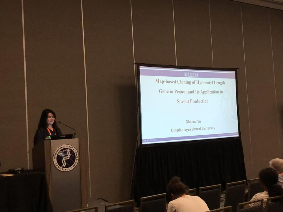 该会议自1992年起每年于美国加州圣地亚哥Town & Country会议中心举行,汇聚全球动植物基因组学领域专家,深入研讨年度最新科研进展,是国际基因组学研究领域的权威学术平台。本届会议历时5天,吸引来自20余国家的3000余名学者参会,共举办200场学术报告。其中,于晓娜在“Phytomedomics and Nutriomics”专题会场作题为“Map-based Cloning of Hypocotyl Length Gene in Peanut and Its Application in Sprout Production”的学术报告,向国际同行系统展示了团队在花生下胚轴长度调控基因的图位克隆与功能解析方面的研究成果,与国际学者进行了深入交流,系统了解生物基因组学领域的前沿动态以及人工智能在分子育种技术中的潜在应用,为花生遗传育种研究的深入推进提供了重要参考依据。参会期间,于晓娜与国内外同行开展了广泛交流,就相关研究方向与国际专家进行了深入探讨,同时,积极向有意向回国发展的海外青年学者宣传推介学校人才引进政策。