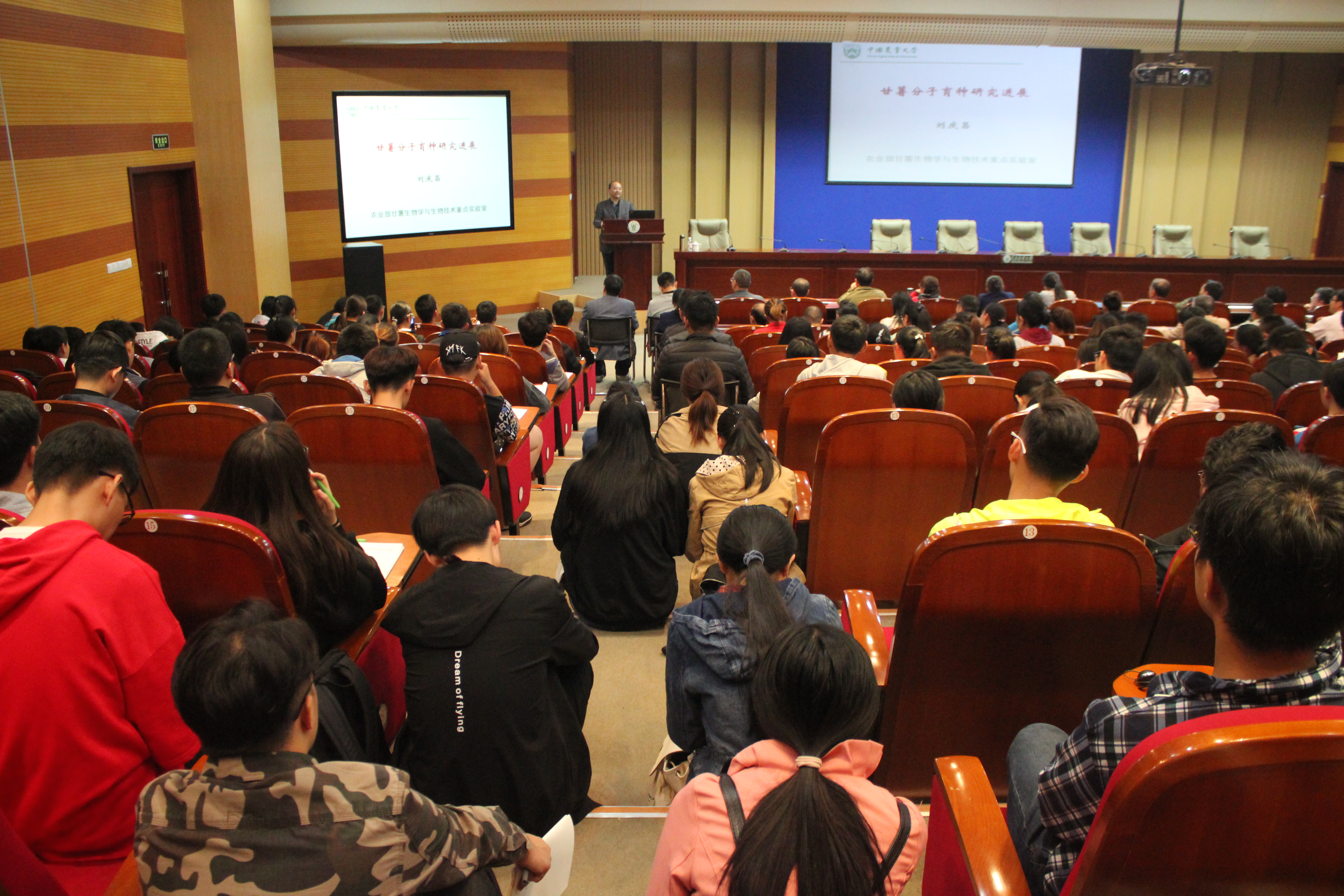 报告会开始,张玉梅介绍主讲人基本情况,并详细解读了学院举办“金穗”学术论坛的目的和意义,希望全体师生珍惜机会,认真听讲,积极领会。随后刘庆昌作“甘薯分子育种研究进展”为主题的学术报告,从世界甘薯生产状况到甘薯研究从业人员情况;从甘薯基因组学到块根发育生物学,从甘薯重要性状形成的分子生物学到分子育种技术都做了详细报告。整场报告由宏观到微观,由浅入深,层层深入,引人入胜,现场更是座无虚席、气氛火爆,除了农学学子,还吸引了植物医学学院等兄弟院系的同学积极参加。
