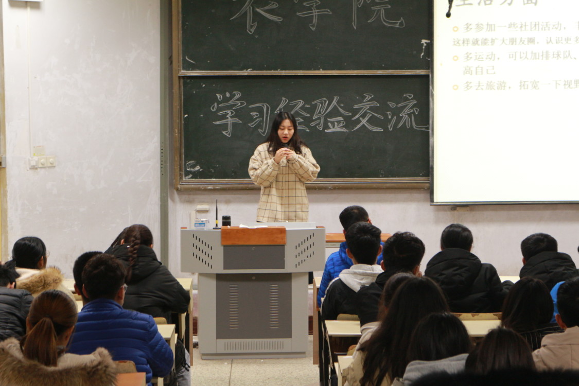 会议伊始,2018级的同学们上台向大一的同学们分享自己的学习经验和教训,通过精美的PPT和耐心的讲解,为同学们解答疑问和困惑。他们详细介绍了高等数学、植物学、普通化学等一些难度较大的学科,他们指出,要想取得优异的成绩,首先要养成良好的学习习惯,但是临近期末,考前突击也必不可少。他们还尤其强调笔记以及课后题的重要,为同学们的复习,指出了一条明路